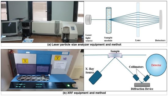 The grain size distribution of binders and SBTs was analyzed using a Malvern Hydro 2000 MU (Malvern Panalytical, Worcestershire, UK) laser particle size analyzer. This device determines particle size distribution by analyzing the laser light scattering pattern from particles in the sample. The analyses were conducted with a refractive index of 1.6 and an ultrasonic mixing time of 5 min, and the results were averaged over three replicates. The chemical compositions of the binders were also analyzed using an ARL 9900 Series XRF Spectrometer (ThermoFisher Scientific, Waltham, MA, USA). This device determines the sample’s chemical composition by measuring the energy of the incident X-rays and the characteristic X-rays emitted as a result of atomic excitation. The equipment used for these analyses is shown in Figure 1.