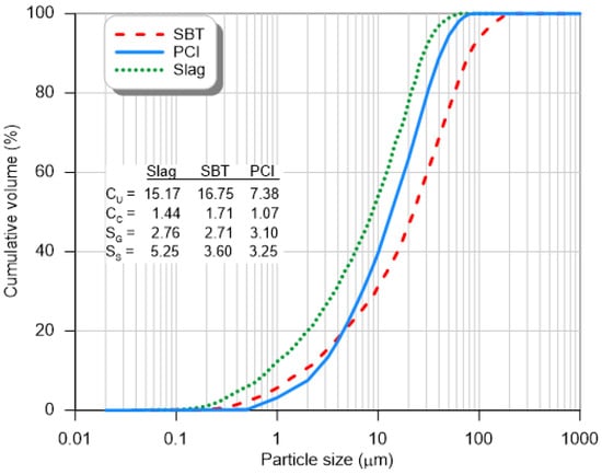 Grain size distribution of SBTs, PCI, and slag (CU = coefficient of uniformity; CC = coefficient of curvature; SG: specific gravity; SS: specific surface area (m2/g)).
