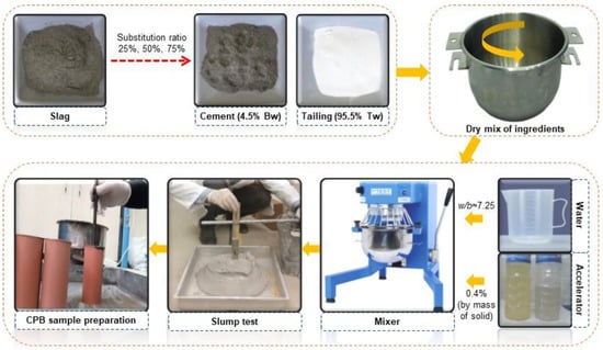 CPB batches, SBTs, binders, AF additives, and water were prepared by combining them in a mixer, and then, CPB samples were formed from these batches to be subjected to various tests (Figure 3). In all CPB batches prepared using the mixer, the binder proportion was set at 4.5% relative to the total mass of tailings, while the AF dosage was fixed at 0.4% based on the solid content. Previous studies have shown that the accelerator admixtures when used above 0.4% increase the porosity and reduce the strength of CPB [37,38,39]. Therefore, 0.4% was determined as an optimum value to ensure sufficient curing time and maintain the desired strength of the mixture [40,41,42]. Blast furnace slag was used in the mixtures by replacing cement at 25%, 50%, and 75% by weight. The target slump value for all CPB batches was set at 20 cm to guarantee flowability, and the materials were adjusted accordingly to achieve this. Table 4 summarizes the mixing ratios of the CPB samples prepared in the laboratory.