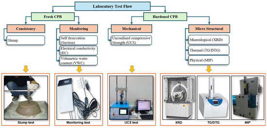 Fresh and hardened CPB specimens prepared in the mixer were subjected to several consistency tests and to monitoring, mechanical, and microstructure tests. Figure 4 illustrates the flowchart detailing the laboratory test procedure for analyzing the prepared specimens.