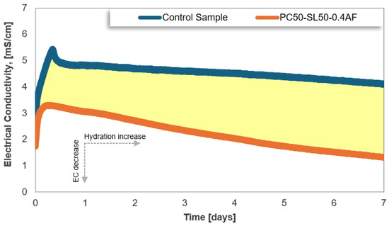 Interestingly, the EC peak value for the PC50-SL50-0.4AF sample (3.30 mS/cm) is considerably lower than that of the control sample (5.45 mS/cm). This can be attributed to the partial replacement of cement with slag, which reduces the availability of charge carrier ions by slowing the dissolution of cementitious compounds. Moreover, the accelerated setting caused by the AF admixture forms a denser gel structure in the early stages, thereby reducing ion mobility. The subsequent decline in EC values for both samples over the 7-day period reflects the precipitation of hydrated phases and the reduced ion mobility due to pore structure densification. Notably, the PC50-SL50-0.4AF sample experiences a steeper decline, reaching a final EC value of 1.33 mS/cm compared to 4.09 mS/cm for the control sample. This indicates a more pronounced reduction in porosity and permeability, potentially enhancing the durability of the CPB mixture.