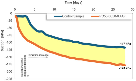Figure 6 shows the 28-day self-desiccation development of the control sample and the sample coded PC50-SL50-0.4AF. The figure shows that for both samples, the negative pore water pressure (suction) grows negatively with time. While the sample coded PC50-SL50-0.4AF exhibited a sudden decrease in suction value in the negative direction after 6–7 h, the control sample showed a negative decrease after approximately 3 days. Following the 28 days of curing, the control sample showed a suction value of −117 kPa, whereas the sample named PC50-SL50-0.4AF demonstrated a suction value of −178 kPa.