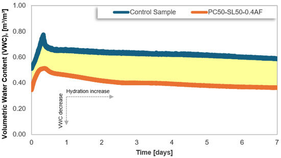 In addition to the water consumption associated with cement hydration, further water loss occurs through the pore network, contributing to overall mass loss [53]. This phenomenon is substantiated by volumetric water content (VWC) measurements conducted on both samples. Figure 7 illustrates the VWC test results for the control and PC50-SL50-0.4AF samples. According to the VWC versus time data obtained from 5TE sensors, the control sample exhibited a higher water content compared to the samples containing slag and AF admixture. This disparity is attributed to the denser microstructure developed in the sample containing slag and AF accelerator during the setting and hardening process. Moreover, the VWC values align with the degree of saturation and porosity of the samples, as previously established in the literature [54]. The MIP tests’ findings on both samples further corroborate this relationship.