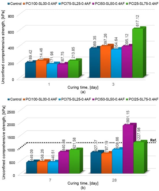 AF accelerators are known to increase early hydration by growing the rate of CH formation and reducing the setting time, thus significantly accelerating early strength. This effect can be seen in the early-age strengths of PCI100-SL00-0.4AF, which performed better than the control sample without any admixture after 1 day of curing time. Following the 1-day curing period, the strength value of the control sample was measured as 189.42 kPa, while the strength value of the sample with 0.4% AF accelerator (PCI100-SL0-0.4AF) was measured as 214.46 kPa. However, the long-term accelerator effect decreases as hydration progresses naturally. After 28 days of curing time, the strength value of the sample containing AF accelerator was measured as 787.19 kPa, while the strength value of the control sample was measured as 827.37 kPa. Previous research indicates that incorporating AF accelerators with Portland cement promotes more hydration products during the initial stages of curing; however, their influence on hydration diminishes significantly beyond approximately 28 days [55,56,57,58]. This is the reason why these admixtures have a more important effect on the initial hardening of the material rather than on the strength achieved after a full 28-day curing period.