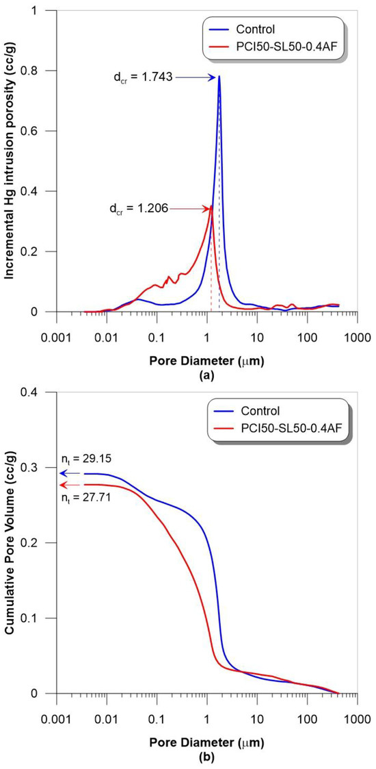 - MIP analysis revealed that the PCI50-SL50-0.4AF sample exhibited lower porosity and a finer pore structure compared to the control, contributing to a denser matrix and improved mechanical properties.