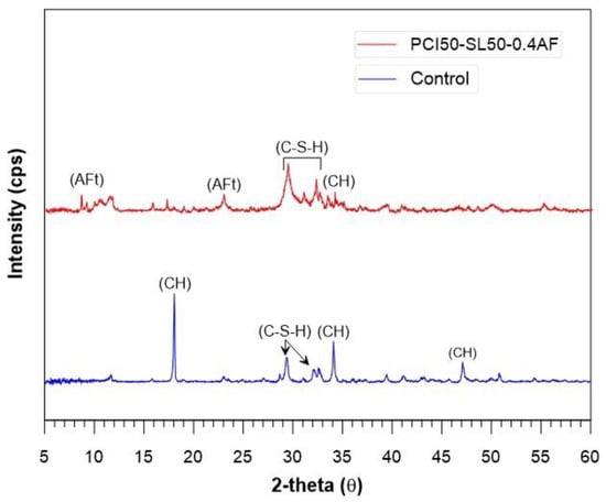 Similarly, cement pastes with a w/b ratio of 2 were designed to mimic PCI50-SL50-0.4AF and control samples for XRD and thermal investigations. The proportions in Table 4 were followed to prepare both cement pastes. The samples were blended in the mixer at the specified proportions and then poured into cylindrical molds and kept cured for 28 days under the appropriate laboratory conditions described in the previous section. All samples were dried in a compressed air oven at 50 °C until a constant weight was obtained to ensure complete removal of moisture. The samples were then ground following the test procedure and subjected to XRD analysis using a Panalytical Empyreyan device. XRD patterns were acquired using a step size of 0.0200° and a scan rate of 1.0000°/min over a 2-theta range of 5–60°.