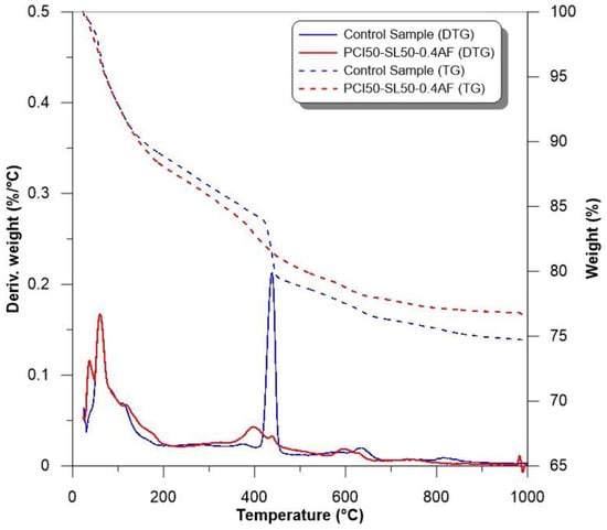 Figure 11 shows the graphs of the TG/DTG of the control and PCI50-SL50-0.4AF coded samples. These graphs provide the possibility to compare the mass losses and decomposition rates of the samples depending on temperature. Figure 11 illustrates that the initial, secondary, and tertiary mass losses and corresponding endothermic peaks are observed within the temperature ranges of 50–200 °C, 400–500 °C, and 600–700 °C, respectively. The mass loss and peaks observed between 50 and 200 °C are ascribed to the dehydration of cement’s hydration products, including C–S–H, carboaluminates, ettringite, and gypsum. In this temperature range especially, the decomposition of physically bound water and some early hydration products is observed. A significant mass loss within this temperature range indicates a high concentration of hydration products or reflects the material’s substantial suction capacity, which may result from hydration mechanisms. At 400–500 °C, CH begins to decompose. During the decomposition of CH, free water is lost, and this process causes both weight loss and a pronounced endothermic peak. In the 600–700 °C range, calcite (CaCO3) decomposition occurs. In this temperature range, carbon dioxide (CO2) is released by the decomposition of carbonate phases, resulting in weight loss and the formation of endothermic peaks.