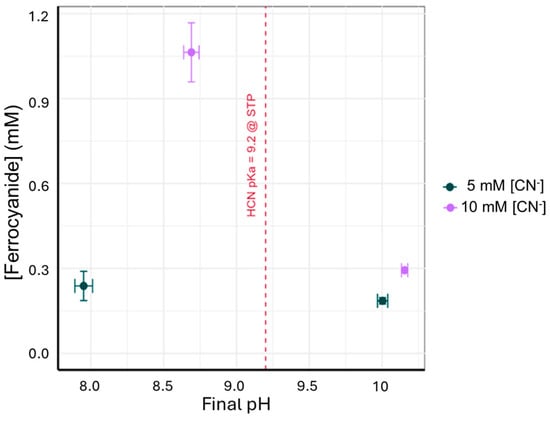 To that first point, we propose that pH is the major factor controlling aqueous ferrocyanide formation. Higher pH is favorable for both aqueous cyanide availability (pKa 9.2) and ferrocyanide complex formation and stability. For experiments near pH 9, there exists a balance of [CN−] available from HCN deprotonation and Fe(II)(aq) available due to brucite solubility. Under this condition, more aqueous cyanide and iron are available to form ferrocyanide, and the ferrocyanide forms a stable complex. If the pH is too low, [CN−] will not be available in the aqueous phase for ferrocyanide formation. On the other hand, Fe(II) availability is favored by acidic pH conditions, whereas ferroan brucite is insoluble at high pH [47].