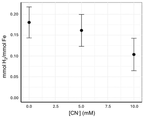 The amount of hydrogen gas produced per mmol of Fe available in brucite as a function of the amount of cyanide added to the system. Each point represents the average hydrogen gas production for the combined replicates, and the error bars represent one standard deviation.