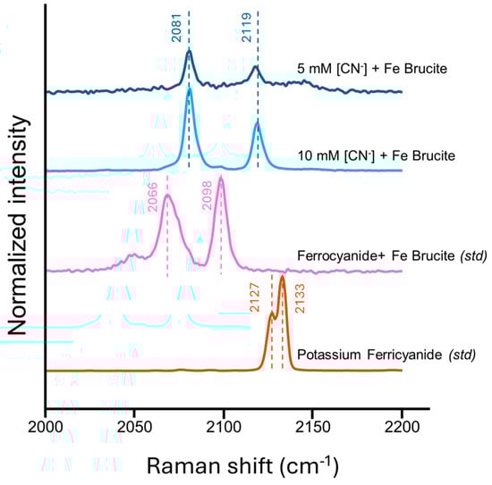 The ferrocyanide/Fe brucite standard had peaks at 2066 cm−1/2098 cm−1, which are in good agreement with the reported ferrocyanide(aq) Raman peaks at 2058 cm−1/2095 cm−1 [41]. When comparing our 10 mM CN− and 5 mM CN− added to ferroan brucite experiments, we measure peaks at 2081 cm−1/2119 cm−1, which, when compared to the reported aqueous standard, is a linear blue shift of 23 cm−1/24 cm−1 and does not correlate with the potassium ferricyanide peaks. This blue shift in the characteristic ferrocyanide peaks is a reported result of ferrocyanide adsorption onto a surface [41,42,43,44,45]. Therefore, we conclude that when cyanide is added to ferroan brucite, we form adsorbed ferrocyanide complexes on the mineral surface.