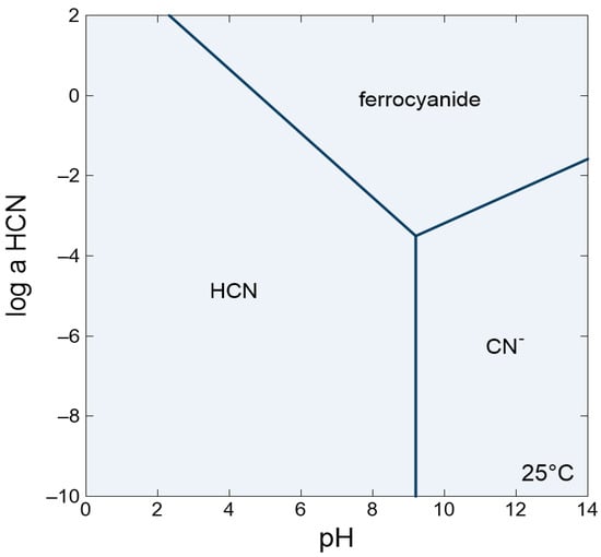 Predominance diagram made using Geochemist’s Workbench® depicting the pH dependence for cyanide speciation and ferrocyanide formation. No surface interactions were included. The following parameters were used: activity of Fe(II) = 0.02, activity of H2O = 1, temperature = 25 °C, pressure = 1 atm across a range of HCN log activity from −10 to 2.