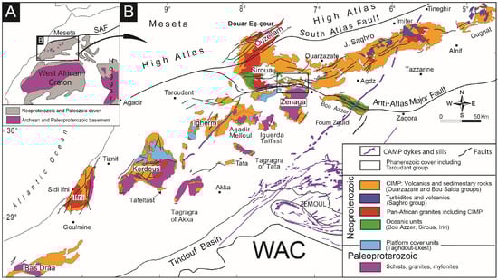 (A) The Anti-Atlas Belt at the northern margin of the West African Craton (WAC); (B) Geological map of the Anti-Atlas Belt in southern Morocco showing distribution of the OuarzazateGroup (i.e., the Central Iapetus Magmatic Province, CIM). Modified after [22,27].