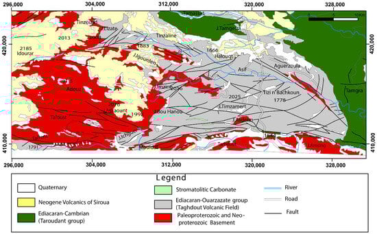 - Karaoui, B.; Breitkreuz, C.; Mahmoudi, A.; Youbi, N. Physical Volcanology, Geochemistry and Basin Evolution of the Ediacaran Volcano-Sedimentary Succession in the Bas Draâ Inlier (Ouarzazate Supergroup, Western Anti-Atlas, Morocco). J. Afr. Earth Sci. 2014, 99, 307–331. [Google Scholar] [CrossRef]