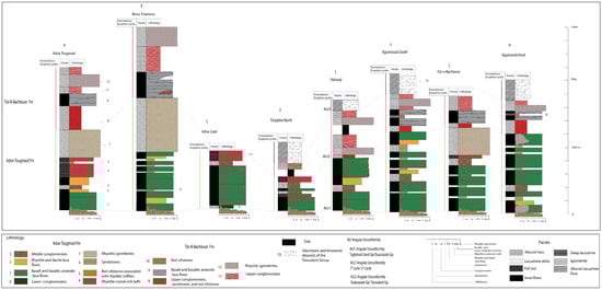 Lithostratigraphic columns across the Ediacaran Taghdout Volcanic Field (TVF), modified after [14]. Legend: 0—Lower conglomerates; 1—Basalt, andesite, and hybrid lava flows and associated pyroclastic rocks (flow breccias and/or blast breccias); 2—Rhyolite and dacite lava flows; 3—Middle conglomerates; 4—Rhyolite crystal-rich tuffs; 5—Red siltstones associated with rhyolitic tuffites; 6—Sandstones; 7—Rhyolitic ignimbrites; 8—Upper conglomerates, sandstones, and red siltstones; 9—Basalt and basaltic andesite lava flows; 10—Red siltstones; 11—Upper conglomerates; 12—Rhyolitic ignimbrites associated with rhyolitic domes and lava flows; 13—Siliciclastic and limestone deposits of the Taroudant Group. Abbreviations: Fm—Formation.