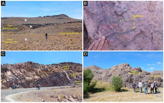 Field photos of the Taghdout Volcanic Field in the Siroua Window. (A) Panoramic view in the Tizi-n-Bachkoun Pass section, showing the angular unconformity between the Adrar Tougmast Formation (rhyolitic crystal-rich tuffs) (1) and the Tizi-n-Bachkoun Formation (basalt and basaltic andesite flows) (2); the ridge comprises red siltstones and upper conglomerates (3). (B) rhyolitic ignimbrites with fiamme of the Tizi-n-Bachkoun Pass section; (C) panoramic view of a sequence of ignimbrites with fiamme of the Adrar Tougmast Formation. At least three cooling units can be seen on the photo; (D) upper conglomerates at the top of the Tizi-n-Bachkoun Formation. Abbreviations: Fm—Formation.