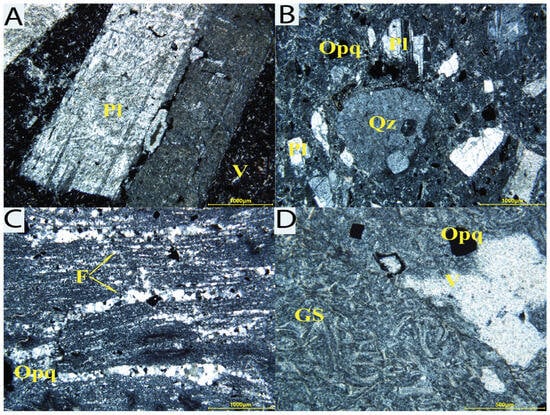 Thin-section photomicrographs showing textures of volcanic rocks of the Taghdout Volcanic Field of the Sirwa Window: (A) Porphyritic andesite with megacrysts of plagioclase. The groundmass consists mainly of plagioclase microliths and minor vesicles, sample NS1; (B) crystal rich quartz, with plagioclase, moderately welded ash flow tuff with the groundmass consisting of quartz, alkali feldspar, and oxide mineral, sample TZ110; (C) ignimbrites with fiamme, sample HQ-138; (D) vitroclastic texture with glass shards, sample H114. Abbreviations: F = fiamme, GS = glass shards, Opq = oxide mineral, Pl = plagioclase, Qz = quartz, V = vesicle. Figure 5A,B,D are cross-polarized light images, whereas Figure 5C is a plane-polarized light image.