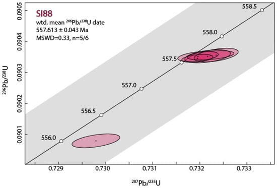 We analyzed a total of six single zircon crystals from sample SI88. Five out of six zircons yielded indistinguishable 230Th-corrected 206Pb/238U dates with a weighted mean of 557.613 ± 0.043 Ma (MSWD = 0.33; see Supplementary Materials Table S1). One zircon yielded a younger date of ca. 556 Ma (Figure 6) that we consider reflecting residual Pb loss. The weighted mean 206Pb/238U date of SI88 tightly constrains the age of the upper part of the volcanic pile and together with previous ages constrains the duration of volcanic activity in the Taghdout Volcanic Field and the Ouarzazat Group as a whole (see Section 5.3).