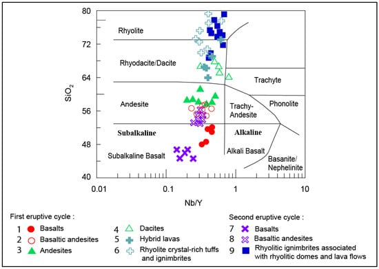 Plot of the studied rocks on the SiO2 vs. Nb/Y diagram [103].