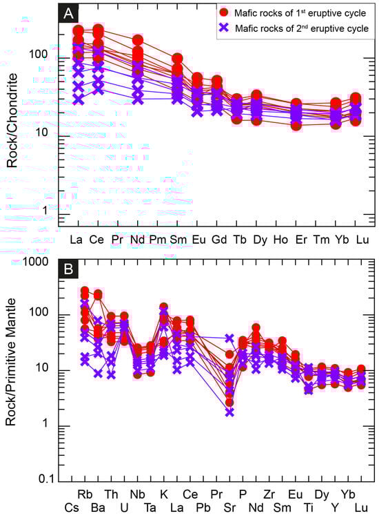 (A) Masuda–Coryell-type Rare Earth Element diagram [104] for the analyzed mafic rocks of the TVF of the Siroua Window. Only non-cumulate rocks are plotted. C1 chondrite values for normalization are from [105]. (B) Primitive mantle-normalized trace element “spidergram” for the analyzed mafic rocks of the TVF of the Siroua Window. Primitive mantle values for normalization are from [105].