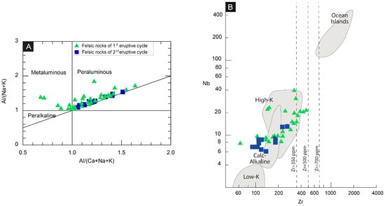 (A) Aluminum saturation diagram after [106,107]. (B) Geochemical characterization of the felsic volcanic and pyroclastic rocks of the TVF in the Nb-Zr diagram of [108].