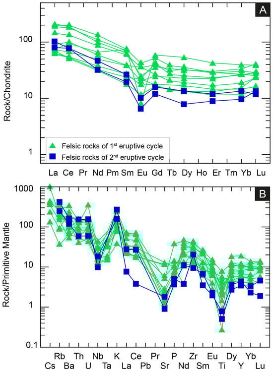 (A) Masuda–Coryell-type Rare Earth Element diagram [104] for felsic rocks of the TVF of the Siroua Window. Chondrite values for normalization are from [105]. (B) Primitive-mantle-normalized trace element “spidergram” for felsic rocks for the TVF of the Siroua Window. Primitive mantle values for normalization are from [105].