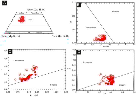 (A) Composition of the clinopyroxenes from basaltic andesites of the 1st eruptive cycle of Taghdout Volcanic Field (Adrar Tougmast Formation; solid circles) and basalts of the 2nd eruptive cycle of the Taghdout Volcanic Field (Tizi-n-Bachkoun Formation; empty circles) in the enstatite (En), wollastonite (Wo), and ferrosilite (Fs) triangle [109]. (B–D) Composition of the studied clinopyroxenes in three discriminant diagrams [110].