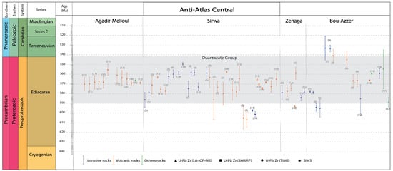 In the Pan-African Anti-Atlas Belt along the northern margin of the West African craton (WAC), the CIMP LIP is well represented by intrusives, volcanics, and sedimentary sequences forming the Ouarzazate Group (“PIII” or XIII of [13]; Figure 1). The latter was not deformed during the Pan-African Orogeny, suggesting its deposition in post-collisional setting during the extensional/transtensional stage in the Pan-African Belt [12,14,15,16,17,18,19,20,21,22,23,24]. The Ouarzazate Group covers a large area of ~2 × 106 km2, with an estimated magma volume of ~1 × 106 km3 and variable volcanic thickness between 300 and 2000 m, and resulted in intense hydrothermal activity, which produced diverse mineral deposits such as Imiter and Zgounder (Ag-Hg), Bou Azzer (Co-Ni-As-Ag-Au), Iourirn (Au), and Bou Madine (Cu-Pb-Zn-Au-Ag) [21,22,25,26].