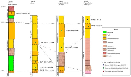 - Saïd, B.; Perrot, M.; Davies, J.H.F.L.; Liégeois, J.-P.; Ikenne, M. The Ediacaran Ouarzazate Group, a Metacratonic Silicic Large Igneous Province (Slip): New U-Pb Zircon Ages From Ouzellarh-Siroua Salient (Tifnoute Valley). In Proceedings of the 56th Annual Meeting, Tucson, AZ, USA, 25–28 October 2021; pp. 1–2. [Google Scholar] [CrossRef]
