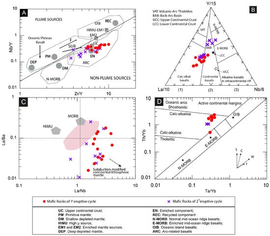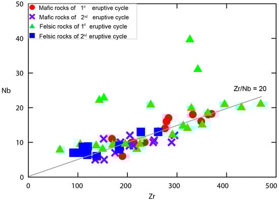 Since the studied rocks show evidence of greenschist-facies metamorphism (association of albite, actinolite, and chlorite) and because high-field strength elements like Nb and Y are less susceptible to alteration during metamorphism than Na2O and K2O, we used the SiO2-Nb/Y diagram [103], considered to be more reliable to distinguish the geochemical affinities of altered rocks than alkali-based schemes. On such a diagram (Figure 7), the volcanic rocks of both eruptive Ediacaran TVF cycles are plotted in the subalkaline field ranging in composition from basalts to rhyolites (SiO2 = 44.6 to 80.8 wt%). According to the systematics shown in Figure 7, the compositional range of the 1st cycle comprises basalts, andesites, rhyodacites/dacites, and rhyolites, while the 2nd cycle ranges in composition from basalts to rhyolites through basaltic andesites. In order to facilitate rock description, they were arbitrarily subdivided into “mafic” and “felsic” rocks, these terms being used in a sensu lato. The mafic group includes basalts and andesites whereas the felsic group includes rhyodacites, dacites, and rhyolites.