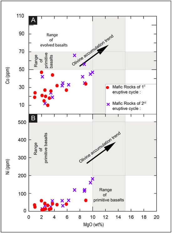 When compared with the mafic rocks of the 1st cycle, the mafic lithologies of the Tizi-n-Bachkoun Formation are significantly less enriched in incompatible elements, as shown, for example, by La (6.98 to 31.6 ppm vs. 21 to 56.15 ppm for the 1st cycle), and have less fractionated REE patterns ((La/Yb)N = up to 8.37) compared to the 1st cycle (up to 13.15). In the normalized multielement diagrams (“spider diagrams”), basalt patterns for the second eruptive cycle of the TVF (Figure 8A) are more variable in LILE (Ba, U, Th) concentrations, having strong Nb, Sr, and Ta negative anomalies (e.g., (Th/Nb)N = 3.50–5.25).