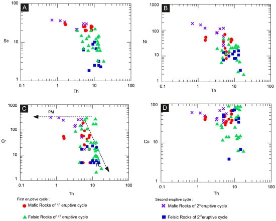 The felsic rocks, plotted in the normalized multielement diagrams (“spider diagrams”), correspond to different stages of magma evolution, with almost all of them showing similar primitive-mantle-normalized patterns (Figure 10A,B), potentially indicating comagmatism. The patterns are all characterized by a significant enrichment in LILE (Rb, Ba, K, and Th), significant and systematic Sr and Ti negative anomalies, with most of them also having marked Nb and Ta negative anomaly ((Th/Ta)N = up to 4.14; (Th/Nb)N = up to 9.44).
