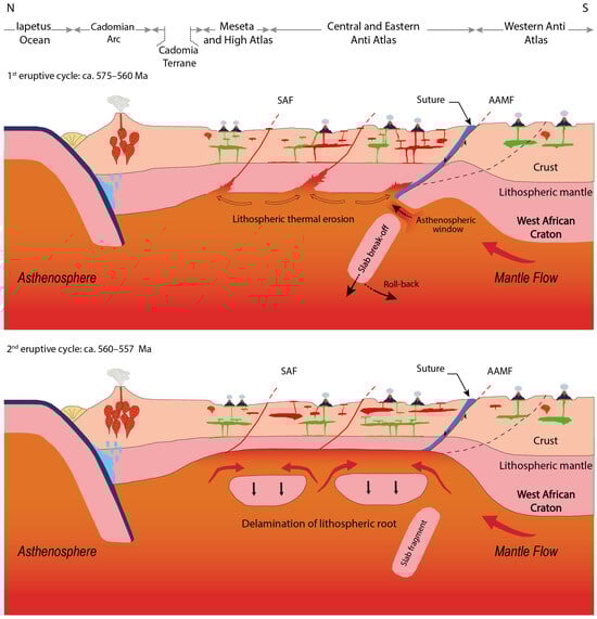 (ii) The Neoproterozoic Pan-African Orogeny (885–545 Ma). The Neoproterozoic sequences of the Anti-Atlas Belt associated with the Pan-African Orogeny are unconformably overlain by the post-collisional, volcano-sedimentary Ouarzazate Supergroup. The latter belongs to the Central Iapetus Magmatic Province (CIMP; [11,18,21,26,43,49,50]). The Neoproterozoic successions underlying the Ouarzazate Supergroup are subdivided into the lower units (Lkest-Taghdout, Bou Azzer, and Iriri groups), affected by all Pan-African orogenic events, and upper units (Saghro and Bou Salda groups), only affected by the latest stage of the Pan-African Orogeny (e.g., [21,22,28,40,43,51]).