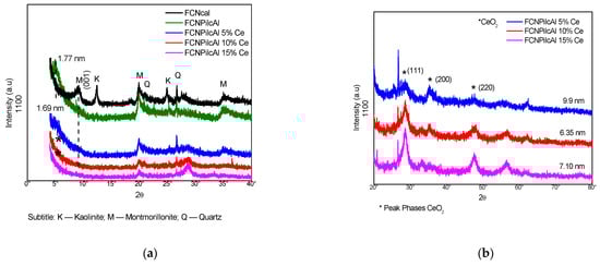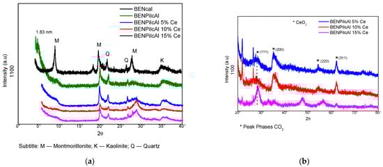 (a) X-Ray diffractogram for the samples of calcined bentonite (BENcal), BENPilcAl, and BENPilcAl impregnated with 5, 10, and 15% Ce with a range of 2θ (3 to 40°); and (b) X-Ray diffractogram for samples of BENPilcAl impregnated with 5, 10, and 15% Ce with a range of 2θ (20 to 80°).