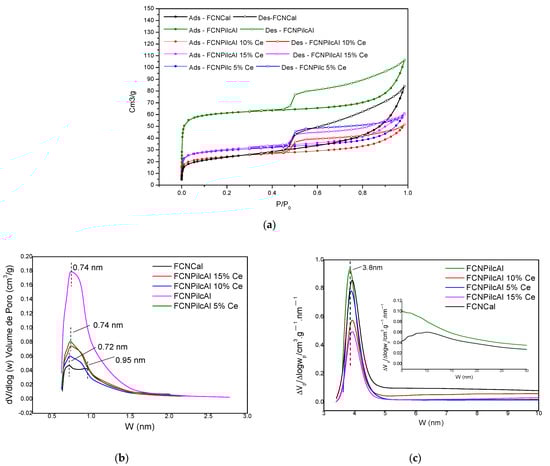 Observing the distribution of pores (Figure 10b,c), as previously discussed, there is uniform distribution of the size of micropores and mesopores, which is the result of the isotherm being parallel to the horizontal axis. In micropores, the average result was around 0.72 nm and in mesopores 3.85 nm. Also regarding these textural analysis results, specific surface area results were analyzed, as well as pore volume. Regarding the specific area results, there were values of 178, 156, and 148 m2/g for 5, 10, and 15% cerium inserted in the pillar, respectively.