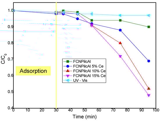 The photodegradation of the samples under investigation is illustrated in Figure 4 as a function of time, measured in minutes, and represented by a graph showing the variation in concentration. In the initial first 30 min of the experiment, an adsorption curve was plotted in the absence of light to evaluate the influence of adsorption on the process. As observed, the samples exhibit negligible adsorption during this initial period, which corroborates the results of the N2 adsorption and desorption analyses [44,45,46]. The curves indicate that the FCN clays pillared with Al and impregnated with Ce presented the best photodegradation results, as evidenced by a reduction in dye concentration compared to the initial dye concentration. The probable presence of cerium on the surface increases the level of active sites, consequently increasing photocatalytic activity.