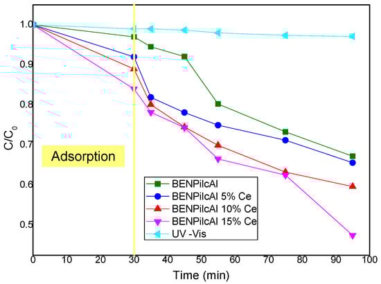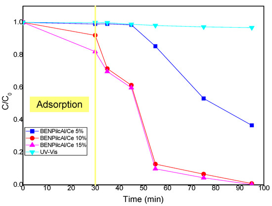 Regarding the BENPilcAl 10 and 15% Ce samples, a slight, more effective degradation process occurred, with more than 50% of the dye concentration degraded for the BENPilcAl 15% Ce sample. This result shows that the amount of cerium contributed to more effective degradation, even accounting for the amount of cerium observed by EDS for the sample impregnated with 15% cerium.