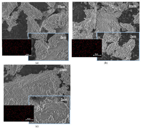 Scanning electron microscopy (SEM) images with energy dispersive spectroscopy (EDS) of samples: (a) BENPilcAl/Ce 5%; (b) BENPilcAl/Ce 10% Ce; and (c) BENPilcAl/Ce 15% Ce. All SEM images are with a magnification range of 1000× to 5000× and working distances of 2 μm and 10 μm. All EDS images are with a magnification of 1000× and working distance of 20 μm.