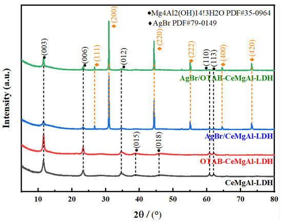 From the FT-IR spectra results as shown in Figure 3, it was found that all hydrotalcites exhibit metal–oxygen (M-O) vibration peaks within the 400–800 cm−1 wavelength range corresponding to the hydrotalcite lattice. The absorption peaks observed at 800–1200 cm−1 and 1356 cm−1 can be attributed to the symmetric and asymmetric stretching vibrations of interlayer CO32−, respectively [33]. Additionally, the absorption peaks at 1600 cm−1 and 3430 cm−1 are caused by the bending and stretching vibrations of -OH in the interlayer water of the hydrotalcites. For OTAB-CeMgAl-LDH, the absorption peaks at 2850 cm−1 and 2920 cm−1 corresponded to the asymmetric and symmetric stretching vibrations of the C-H bonds in the alkyl side chains of the surfactant. In AgBr/OTAB-CeMgAl-LDH, the C-H bond stretching vibration absorption peak shifts to 2830 cm−1 due to the attraction of AgBr, resulting in a longer C-H bond.