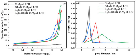 The pore structure of different hydrotalcites was analyzed through BET characterization with the results presented in Figure 2 and Table 1. As shown in Figure 2a, all hydrotalcites exhibit type IV isotherms with distinct H3 hysteresis loops, and the N2 adsorption gradually increased and reached a noticeable inflection point at a P/P0 of 0.8, indicating monolayer adsorption. Conversely, increasing P/P0 causes a hysteresis loop due to macropore filling induced by the condensation of N2 molecules within the hydrotalcite channels, leading to a rapid increase in adsorption volume. The pore size distribution curves in Figure 2b indicate that OTAB-CeMgAl-LDH and AgBr/OTAB-CeMgAl-LDH have a wider size distribution compared to CeMgAl-LDH and AgBr/CeMgAl-LDH. This can prove that the three-dimensional networks were constructed using worm-like micelles as templates. According to Table 1, the decrease in surface area over the supported hydrotalcite was found due to the covering or blocking of AgBr particles with a high dispersion of AgBr.