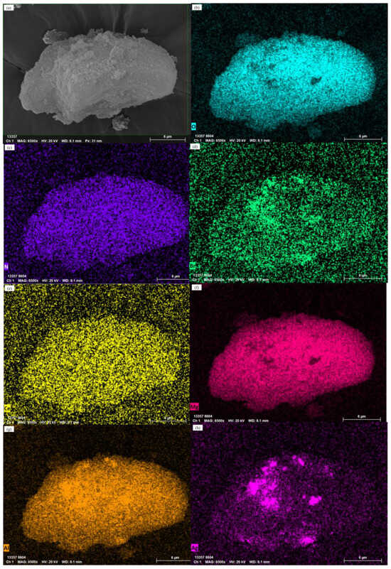 Figure 5 displays the EDS spectra of AgBr/OTAB-CeMgAl-LDH. The uniform distribution of elements such as O, N, Ce, Mg, and Al on the material surface can be seen. Additionally, Figure 5d,h shows that the Ag and Br elements are also uniformly distributed across the hydrotalcite surface, suggesting that AgBr is highly dispersed on the structured hydrotalcite, which is advantageous for enhancing the photocatalytic activity by providing more active sites for producing radicals. Furthermore, the high correlation in the distribution of Ag and Br elements confirms their presence in the form of AgBr. The prominent color display in the EDS spectra might be due to the excess of Ag and Br elements, resulting in partial aggregation in the central region of the hydrotalcite.