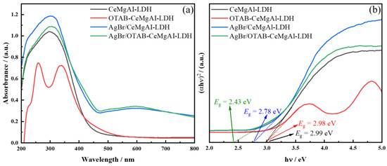 The UV-visible diffuse reflectance spectra of CeMgAl-LDH, OTAB-CeMgAl-LDH, AgBr/CeMgAl-LDH, and AgBr/OTAB-CeMgAl-LDH are illustrated in Figure 6a. For CeMgAl-LDH and OTAB-CeMgAl-LDH, a wide absorption range between 200 and 500 nm can be found, with strong absorption in the UV region (λ < 400 nm) but weaker absorption in the 400–500 nm range and no significant absorption at wavelengths λ > 400 nm. In contrast, AgBr/CeMgAl-LDH and AgBr/OTAB-CeMgAl-LDH show absorbance values in the of UV and visible light ranges, indicating an expanded light response range from 200 to 800 nm. Additionally, the structured hydrotalcites (OTAB-CeMgAl-LDH, AgBr/OTAB-CeMgAl-LDH) display a red shift to the visible region compared with the hydrotalcites (CeMgAl-LDH, AgBr/CeMgAl-LDH), which suggests that the structured hydrotalcites with multiscale pores show significantly enhanced visible light absorption [35,36].