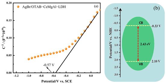 To further elucidate the band structure of AgBr/OTAB-CeMgAl-LDH, the flat band potential of the sample was determined using Mott–Schottky analysis (Figure 7a). The results indicate that the slope of the Mott–Schottky (M-S) curve is positive, confirming a typical n-type semiconductor of AgBr/OTAB-CeMgAl-LDH. Considering that 0.1–0.3 eV is above the conduction band to the Fermi level of n-type semiconductors, 0.241 V was selected in this study. The Mott–Schottky plot reveals that the flat band potential of the sample relative to the saturated calomel electrode was −0.57 V, yielding a conduction band potential of approximately −0.33 V [39,40]. Moreover, combining the band gap energy measured from UV-Vis DRS with Equation (3), the band structure of AgBr/OTAB-CeMgAl-LDH is depicted in Figure 7b.