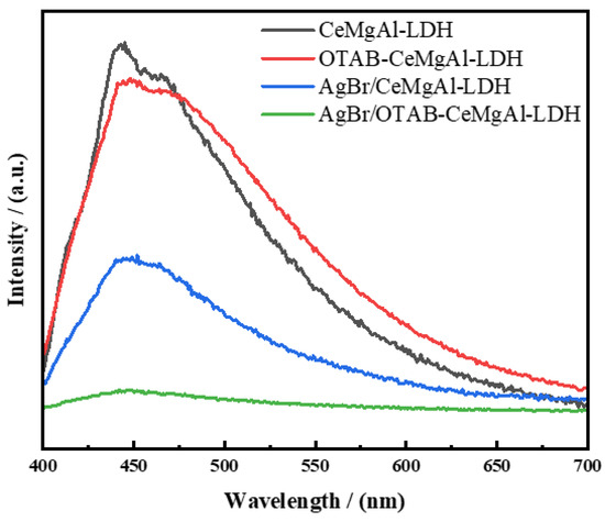 The PL spectra of the catalysts at an excitation wavelength of 380 nm are shown in Figure 8. The results indicate that CeMgAl-LDH, OTAB-CeMgAl-LDH, AgBr/CeMgAl-LDH, and AgBr/OTAB-CeMgAl-LDH all exhibit strong fluorescence intensity peaks around 445 nm, while adding AgBr decreased the intensity, indicating the low recombination rate of photogenerated electron–hole pairs. Moreover, the fluorescence intensity of AgBr/OTAB-CeMgAl-LDH was significantly lower than that of AgBr/CeMgAl-LDH, suggesting that AgBr/OTAB-CeMgAl-LDH possesses a more favorable photogenerated electron–hole separation efficiency. This is attributed to the high specific surface area and hierarchical porous structure derived from the micelle template, as suggested above. More effective inhibition of the photogenerated electron–hole pair recombination can be obtained over high-dispersion AgBr [41,42,43].