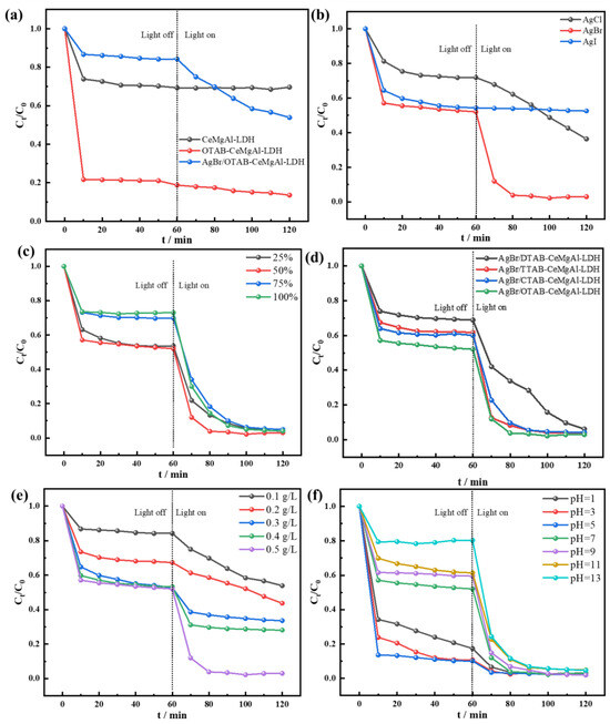 Catalytic properties investigation. (a) Effect of different hydrotalcite catalysts on catalytic performance; (b) effect of halogen element on catalytic performance; (c) effect of AgBr support on catalytic performance; (d) effect of micelle type on catalytic performance; (e) effect of structured hydrotalcite dosage on catalytic performance; (f) effect of initial pH on catalytic performance.