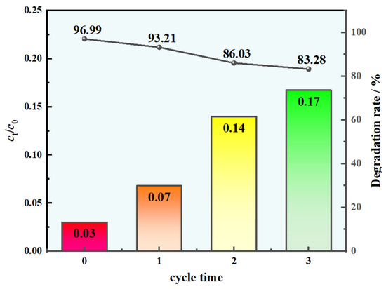 The surface plasmon resonance (SPR) effect can be generated by trace amounts of Ag0 on the catalyst surface, which was controlled by adjusting factors such as the size and morphology of the metal particles. This control enhances the light absorption properties of Ag0 nanoparticles in the visible to near-infrared region, thereby extending their light response range. However, excessive Ag0 hinders the contact between the catalyst and light source, significantly impeding the practical application of AgBr/OTAB-CeMgAl-LDH in photocatalysis. To mitigate the loss of Ag during catalyst regeneration, H2O2 was used as a mild oxidizing agent to recover Ag0 from the photocorrosion and decomposition of AgBr/OTAB-CeMgAl-LDH, supplemented with KBr solution to replenish the Br source [45]. The degradation behavior of methyl orange solution (25 mg/L) using the recycled catalyst (0.5 g/L) was studied at 25 °C and pH 7. As shown in Figure 10, the favorable regeneration performance of AgBr/OTAB-CeMgAl-LDH caused it to maintain a removal rate of 83.28% for methyl orange after three cycles.