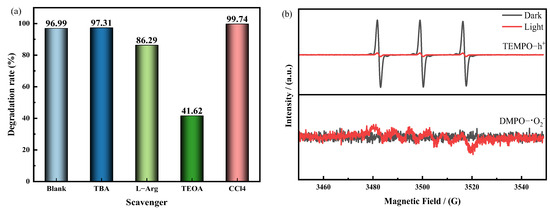 (a) Active species capture experiments; (b) EPR spectra of h+ and •O2−.