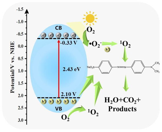 The proposed mechanism for the photocatalytic process is depicted in Figure 12. AgBr, as the primary photocatalytic active component, generates electron–hole pairs under light to initiate the photocatalytic reaction. The introduction of OTAB-CeMgAl-LDH significantly increases the specific surface area of the composites, which provides more active sites to enhance the opportunity for contacting methyl orange with catalysts. Firstly, electrons in the valence band of AgBr/OTAB-CeMgAl-LDH are excited to the conduction band and electrons transition from the valence band (VB) to the conduction band (CB), forming photogenerated electron–hole pairs (Equation (4)) with simulated sunlight irradiation. Due to the increase in the specific surface area of LDH when using worm-like micelle as templates, a great probability of the sample contacting pollutants is provided. Such structural modification also broadens the light response range and suppresses the recombination of electron–hole pairs. Therefore, O2 adsorbed on the surface of the photocatalyst is reduced by photogenerated electrons (e−) in the conduction band (CB) to form superoxide radicals (•O2−), or it is oxidized by photogenerated holes (h+) in the valence band (VB) to generate singlet oxygen (1O2) (Equations (5)–(7)). Both •O2− and 1O2 participate in the photocatalytic degradation of methyl orange. Furthermore, the highly oxidative holes (h+) in the VB degrade methyl orange into smaller molecular products such as H2O and CO2 (Equation (8)).