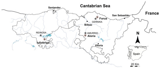 - Núñez Marcén, J.; Cepeda Ocampo, J.J.; Esteban Delgado, M.; Filloy Nieva, I.; García García, M.L.; Gil Zubillaga, E.; Hernández Vera, J.A.; Martínez Salcedo, A.; Ruiz-Gutiérrez, A.; Réchin, F. La romanización en el Cantábrico Oriental. In Medio Siglo de Arqueología en el Cantábrico Oriental y su Entorno; Llanos Ortiz de Landaluze, A., Ed.; Instituto Alavés de Arqueología: Vitoria-Gasteiz, Spain, 2009; pp. 345–448. [Google Scholar]