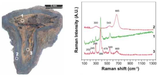 Representative section of a nail from the Forua site showing the development of corrosion and the absence of metal in the inside of the nail. Micro-Raman spectra of the corrosion products (1 = goethite, 2 = magnetite, 3 = goethite and magnetite).