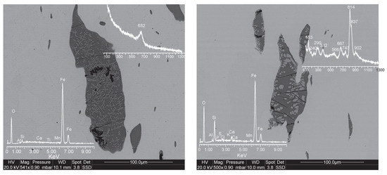 SEM-EDX allowed the non-metallic inclusions to be examined. Most of the slag inclusions were elongated and were aligned with the longitudinal axis of the nails. The non-metallic inclusions appeared to be mainly composed of aggregates of two different phases: a dendritic FeOx-rich phase and a globular FeO·SiO2 phase (Figure 5). Micro-Raman spectroscopy analyses identified the nature of the inclusions. The slags of samples Al-06, Al-07 and Al-11 were found to be composed of wüstite (FeO) and fayalite (Fe2SiO4) trapped in a glassy matrix. In contrast, the Al-03 inclusions appeared formed by a single dark phase consisting of a glassy matrix.